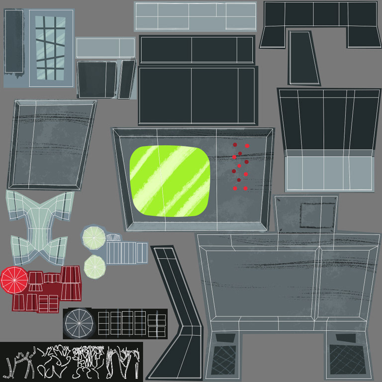Here are a couple of the UVs I made for the larger 3D props.